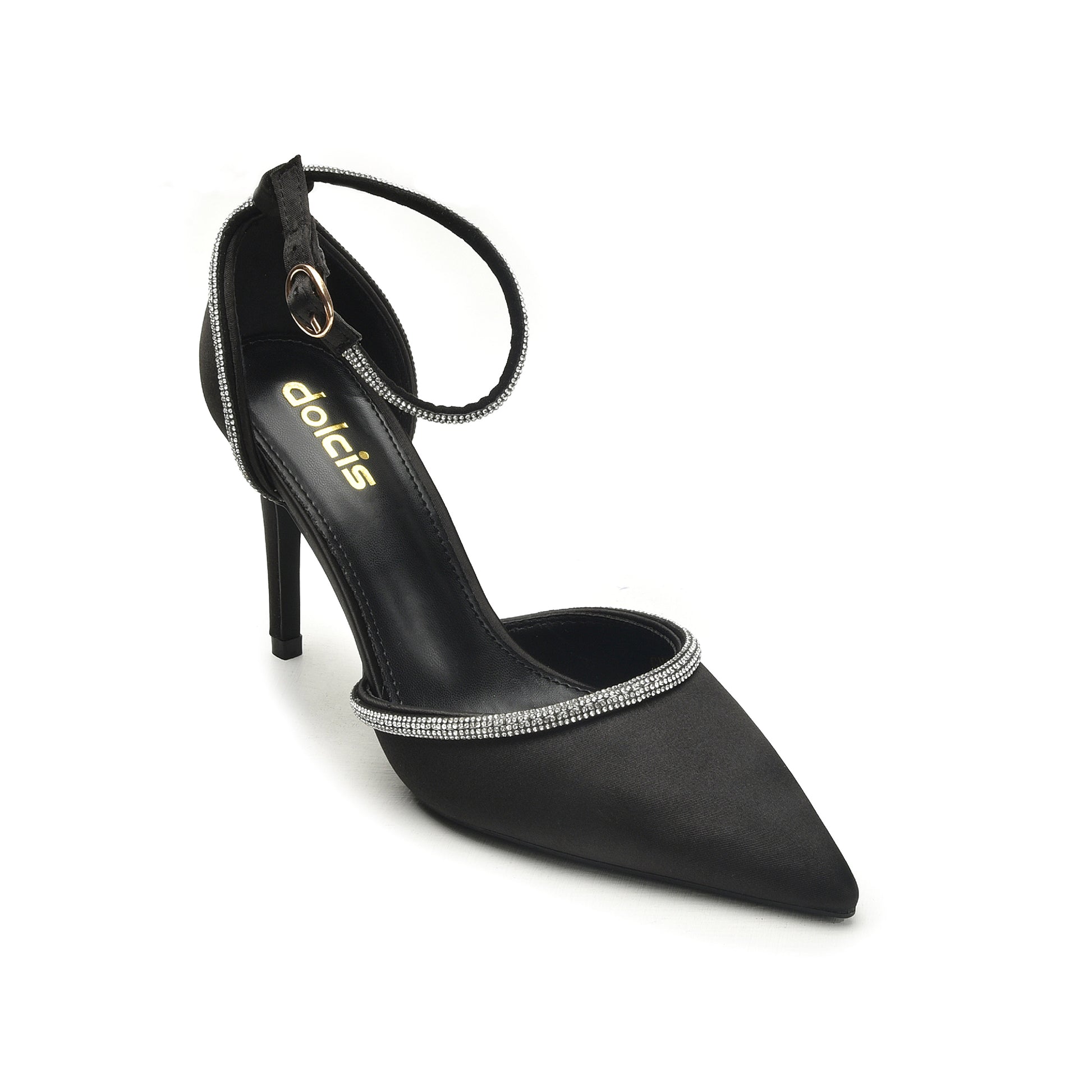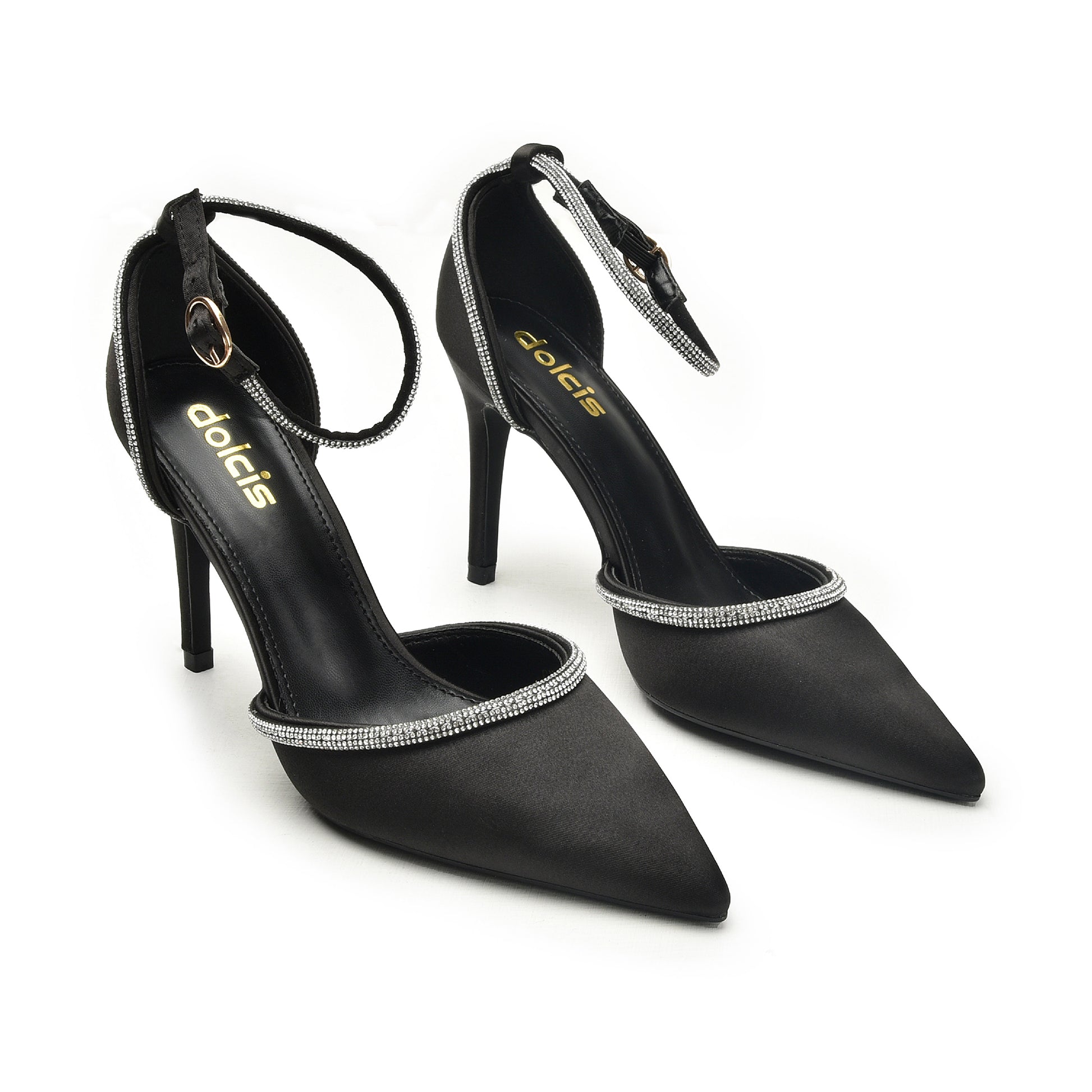 Elegant Black Ankle Strap Heels with Rhinestone Trim | 440N