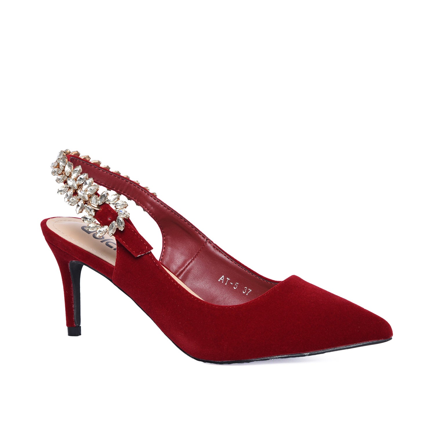 Red Velvet Slingback Heels with Crystal Embellishment | 495H-E