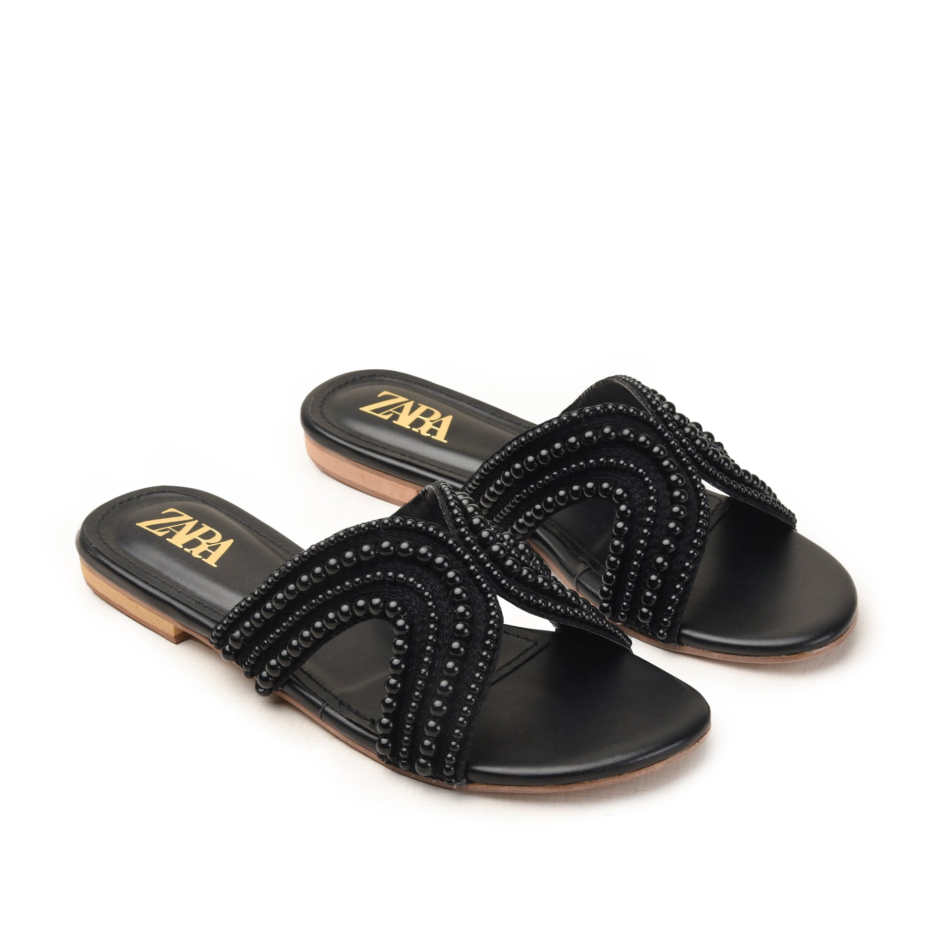 Black Pearl-Embellished Flat Slides Slippers| 520M-C